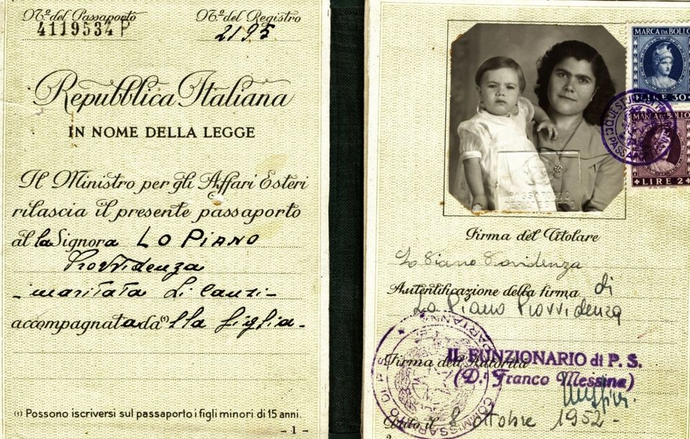 Mom's 1952 passport, she was 2. In the border of the circular purple stamp is the town name of PARTANNA, where she lived and was born in.