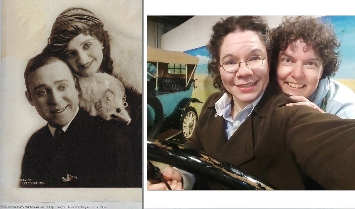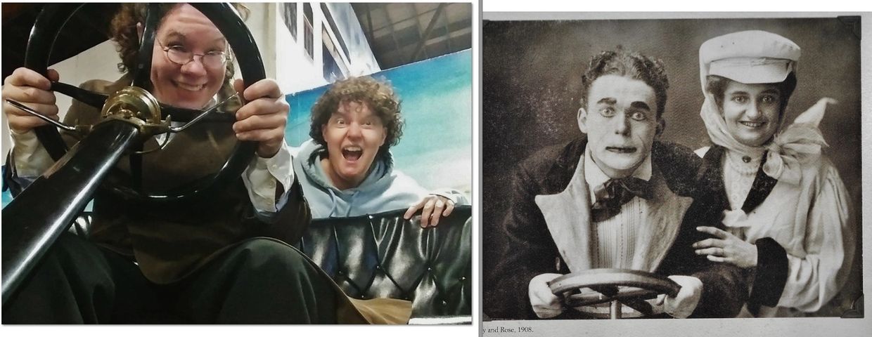 DownloadYes, I have crossed paths with Rose Langdon, and was in a relationship with her from 2013 to 2020. Rose was Harry Langdon's first wife and they married in 1904, when Harry was 20 and Rose was 22. They divorced in 1928. To begin with, here are a couple photos of us at the Sacramento Car Museum in 2019, next to photos of Harry and Rose from their vaudeville days, 1908-10. When we took these pictures, it was in the spirit of fun. I had no idea I was sitting beside Rose at the time nor were we trying to consciously re-create Harry and Rose's vaudeville publicity photos. I'll have a couple more comparison photos of Rose and Jessica at the end after I talk about how we met. Notice how similar their hands look below, especially their pinky fingers. Jessica also has the same intense look in her eyes as Rose did, plus similar smile and teeth.